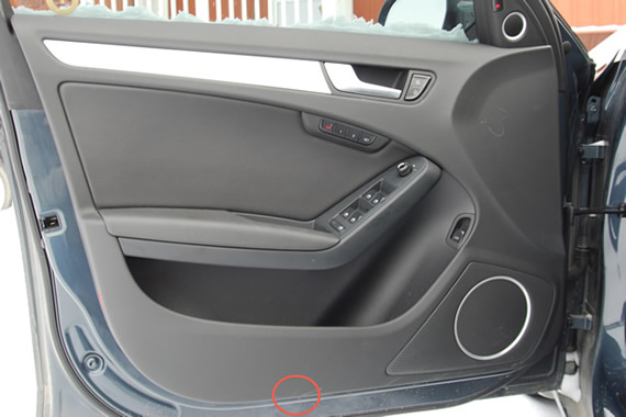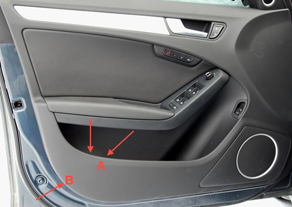 So as I mentioned above, if you don't have trim tools pull firm and fast at location A, almost in a snapping motion. I think of clips as band aids quick and sharp. Once the corner of the door is lifted put your hands under the panel at B and just repeat the action until all the clips are released.