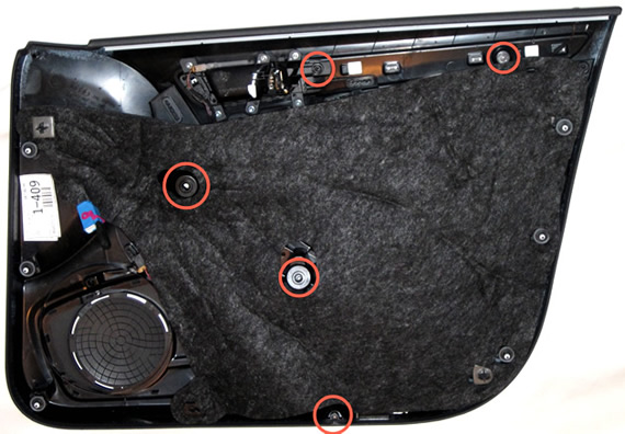 Once the lower trim is removed you need to remove 5 T20 screws before unclipping the door panel from the door. I'm sorry I don't have a great picture showing the screw locations but this should be more than enough for you to find them.