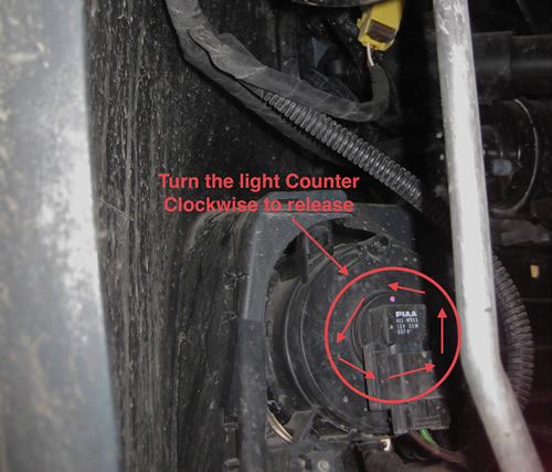 Pull back the wheel liner and you'll be able to see the back of the fog light. To remove the fog light simply turn the light counter clockwise.