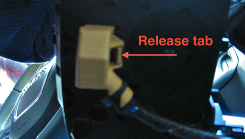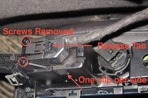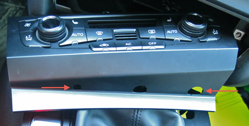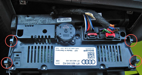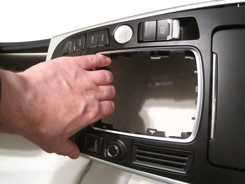 Once the AC unit is out put your hand under the back of the MMI controls and pull up. This will pull the clips out of the console. I always work with a quick and positive motion when I work with clips to prevent any undue stress to the unit. Do not pull up to far as there are a number of plugs to be undone and the one for the push start if equipped is fairly short.