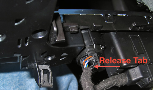 Slide a small screw driver in to depress the tab and just pull on the harness. That is the easiest way to release them.