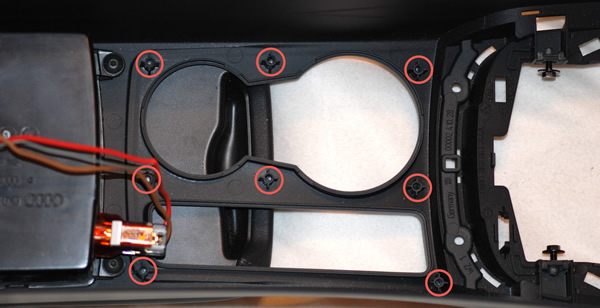 Once you have the centre console out remove the 8 T20 screws that hold that hold the cup holder in place:
